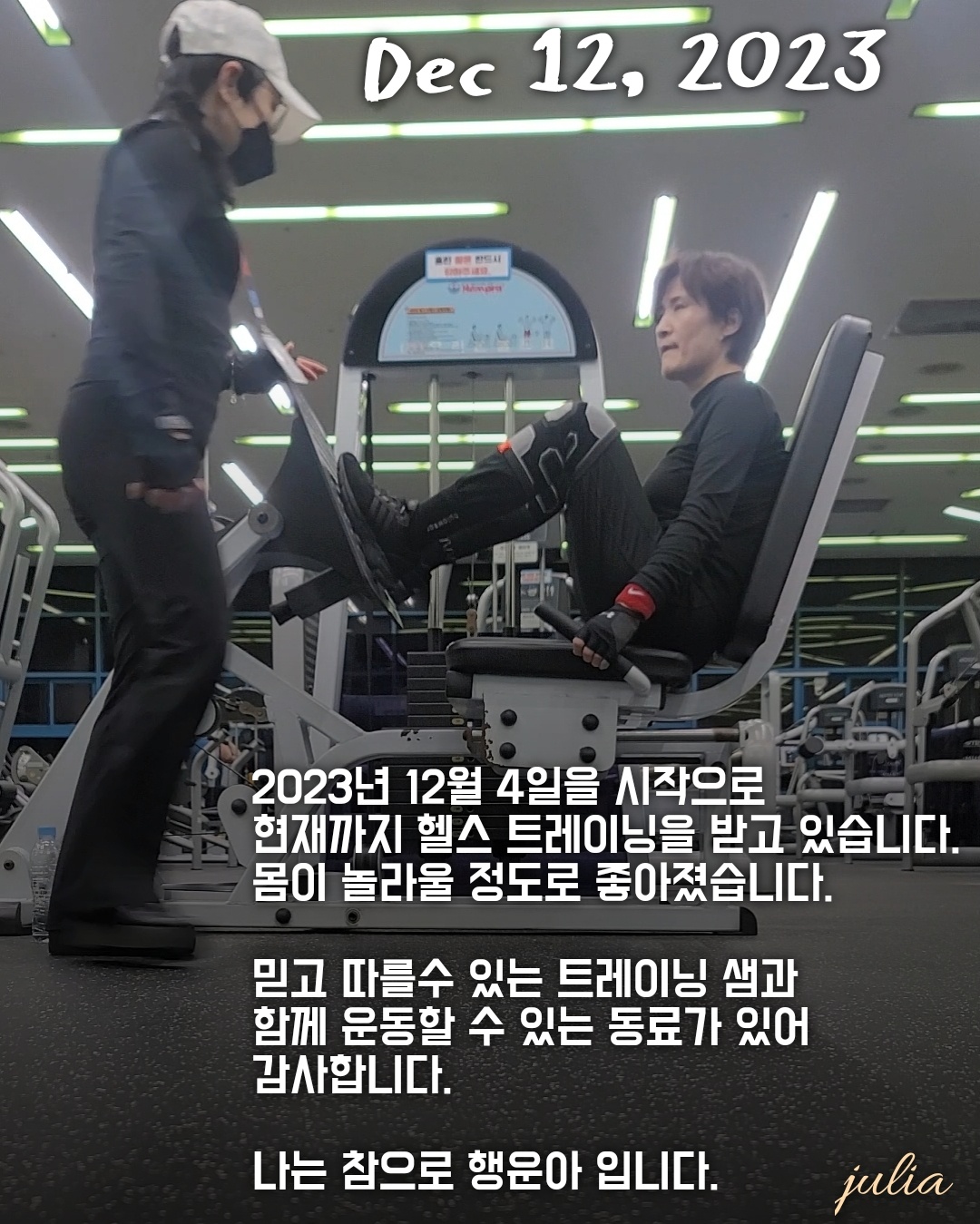 월요일부터 금요일까지 매일 헬스장에 가서 운동을 하였습니다. 아주 천천히 내 몸에 맞는 페이스로 이경민 선생님은 지도하여 주셨습니다. 첫 주가 지나고, 둘째 주가 지나고, 12월 19일 세 번째 주를 맞이하고 있습니다.