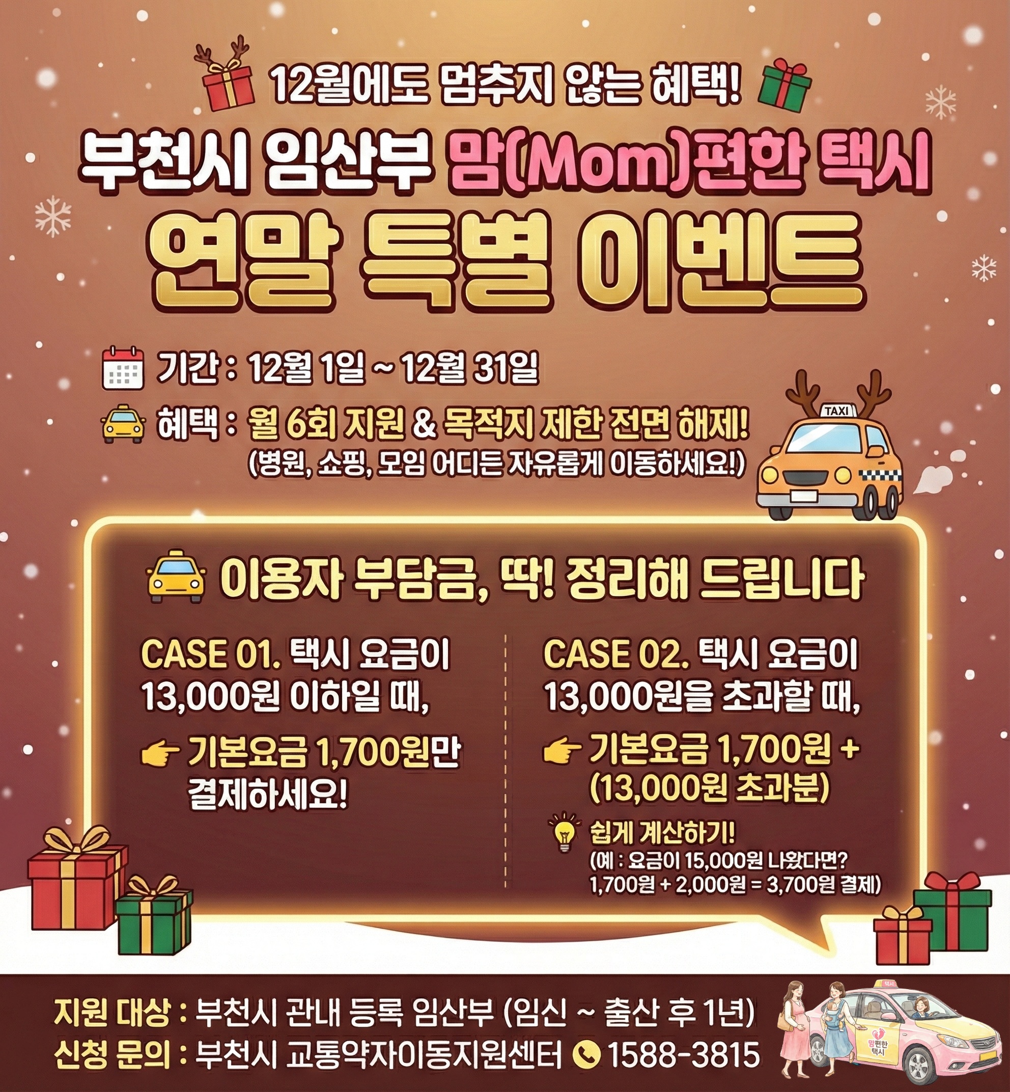 [부천시 교통약자이동지원센터] 부천시 임산부 맘(Mom)편한 택시 서비스 12월 이벤트 '해피 엔딩(Happy Ending)' 안내
