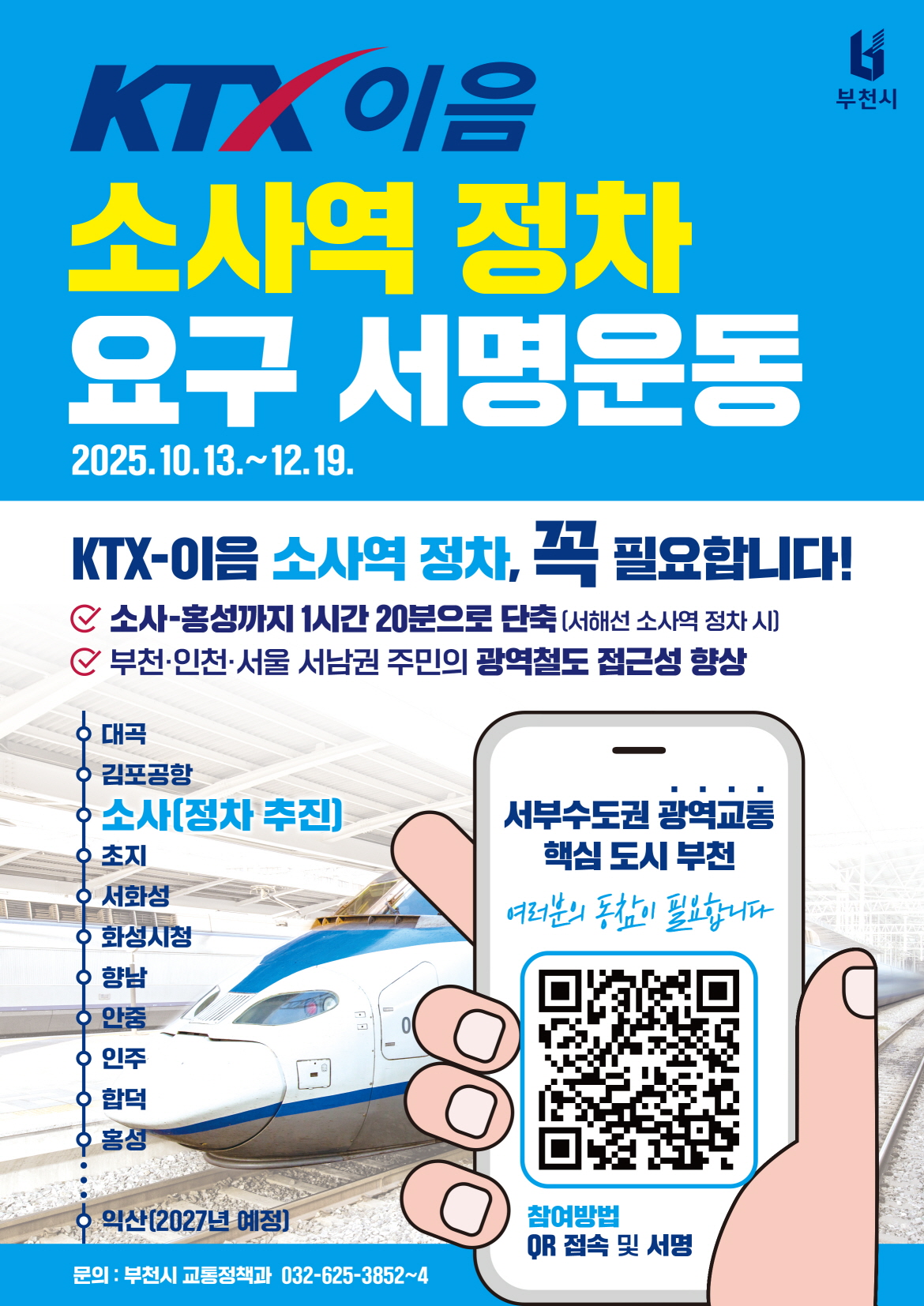 KTX 이음 소사역 정차 요구 서명운동 공지번호2025169 작성자 조** 등록일자 2025년 10월 27일 16시 53분 45초 조회 642 부천시에서는 서해선 KTX-이음 열차의 소사역 정차 추진을 위해 시민 공감대 확산과 참여 유도를 목적으로 10만 시민 서명운동을 진행하고 있습니다. 많은 참여부탁드립니다. KTX이음 소사역 정차 서명운동_포스터2.jpg [ Size : 815.08KB , Down : 363 ] 미리보기 다운로드 목록보기