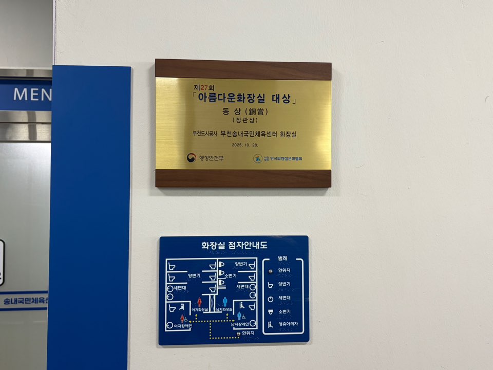 부천도시공사(사장 원명희)가 운영하는 부천송내국민체육센터 화장실이 행정안전부·한국화장실문화협회 주관‘제27회 아름다운 화장실 대상’에서 동상(행정안전부장관상)을 수상했다.