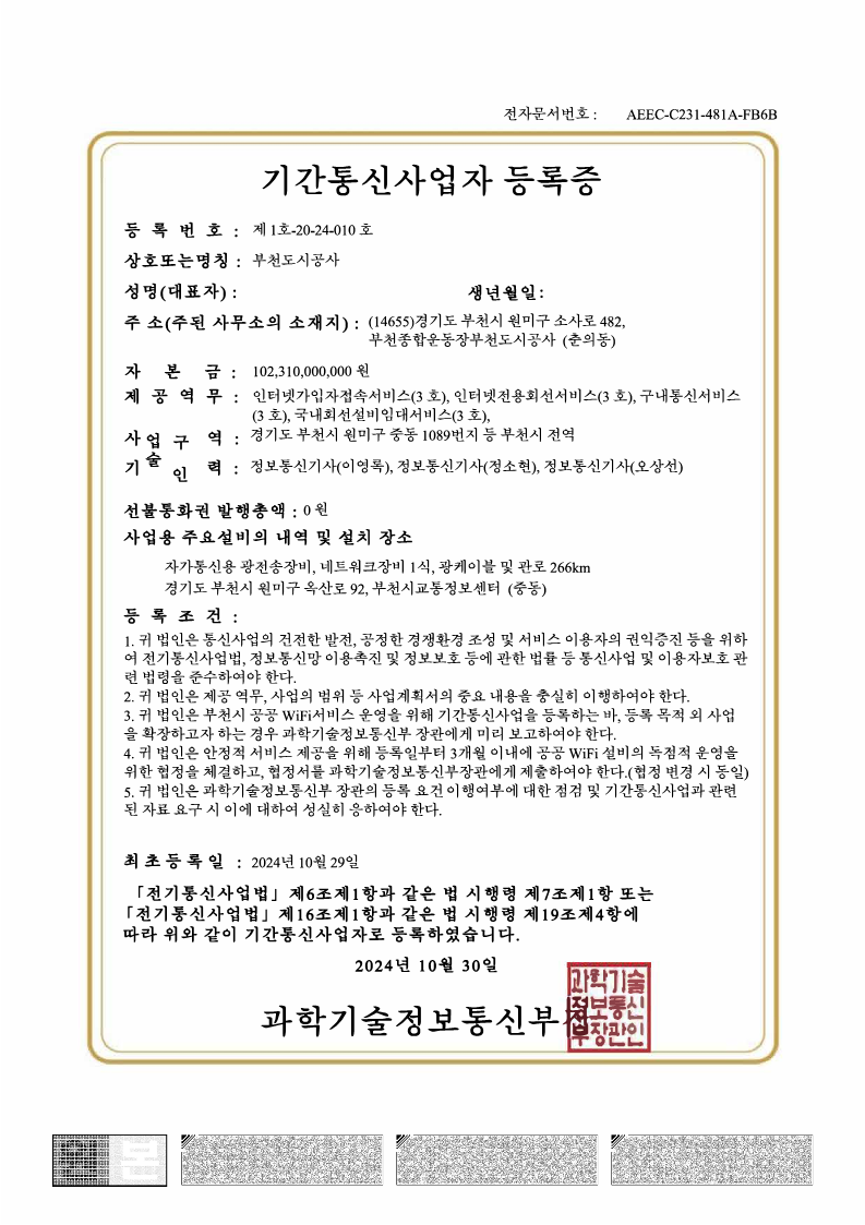 부천시는 최근 스마트챌린지 사업의 일환으로 공공 와이파이 서비스를 구축하며 시민들에게 보다 나은 통신 환경을 제공하기 위한 노력을 기울여왔다. 그러나 공공와이파이 서비스의 운영 관리에 있어 전기통신사업법에 따라 기간통신사업자만이 해당 업무를 수행할 수 있다. 이에 따라 부천도시공사는 「기간통신사업자」를 등록함으로써 직접적인 운영 관리가 가능해졌다.