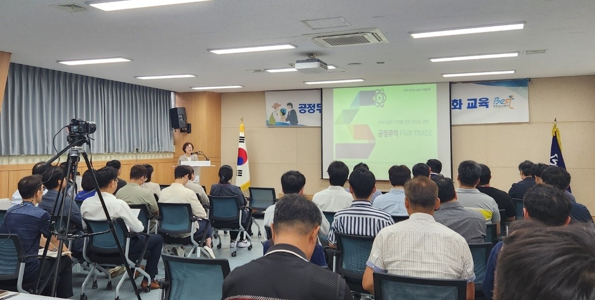 이날 교육 강사로 나선 부천공정무역협의회 원건형 대표는 ▲공정무역 제품의 가치, ▲공정무역 10대 원칙, ▲ESG 경영, ▲공정한 가격, ▲공정무역 제품, ▲인증마크 등 공정무역의 의미와 필요성에 대해 교육을 진행하였다.