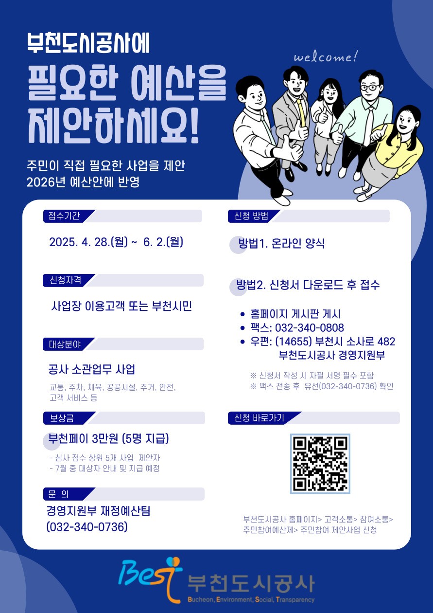 부천도시공사(사장 원명희)가 2026년도 예산 편성을 앞두고 시민의 아이디어를 반영하기 위해, 4월 28일부터 6월 2일까지 주민참여예산 제안사업 공모를 진행한다고 밝혔다.