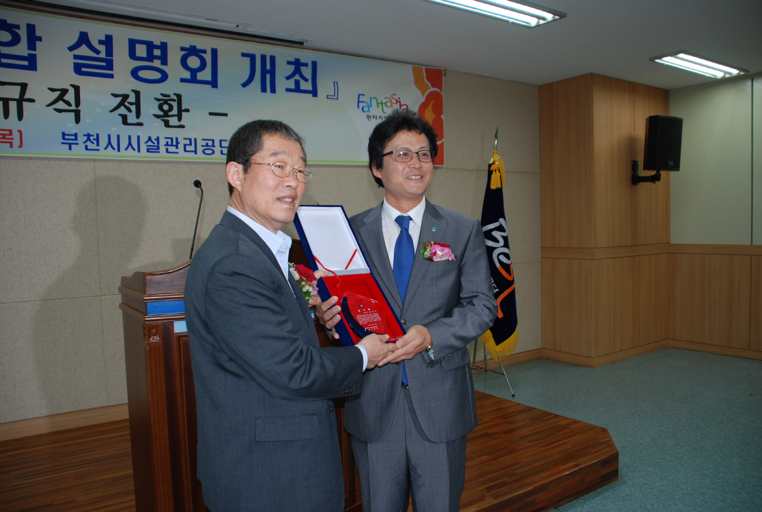 공단은 2012. 5. 3 부천종합운동장 대회의실에서 중앙·지역언론사와 지방공기업 관계자들을 대상으로 『직군통합』에 관한 공식적인 설명회 자리를 갖는 한편, 직군통합의 성과와 의미를 대외적으로 전파했다. 특히, 이날 행사에는 한국노총 이용득 위원장이 참석하여 노동계 최대과제인 ‘비정규직의 정규직화’에서 한발 더 나아가, 전국 공기업 최초로 직군통합을 이룬 성과에 대해 높이 평가하며 부천시장에게 감사패를 전달하기도 하였다.