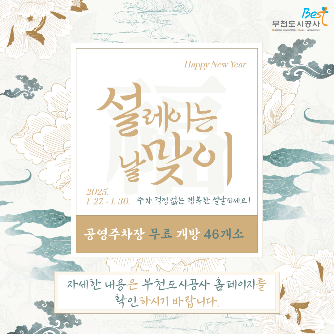 이번 무료 개방은 1월 27일(월)부터 1월 30일(목)까지 나흘간 진행하며, 노상 및 부설 주차장 등 시민 누구나 이용할 수 있는 46개소가 포함된다. 특히, 1월 27일이 임시공휴일로 지정됨에 따라 이용 기간이 확대되어 더 많은 시민에게 편의를 제공할 수 있을 것으로 기대된다. 자세한 사항은 부천도시공사 홈페이지(www.best.or.kr)에서 확인할 수 있다.