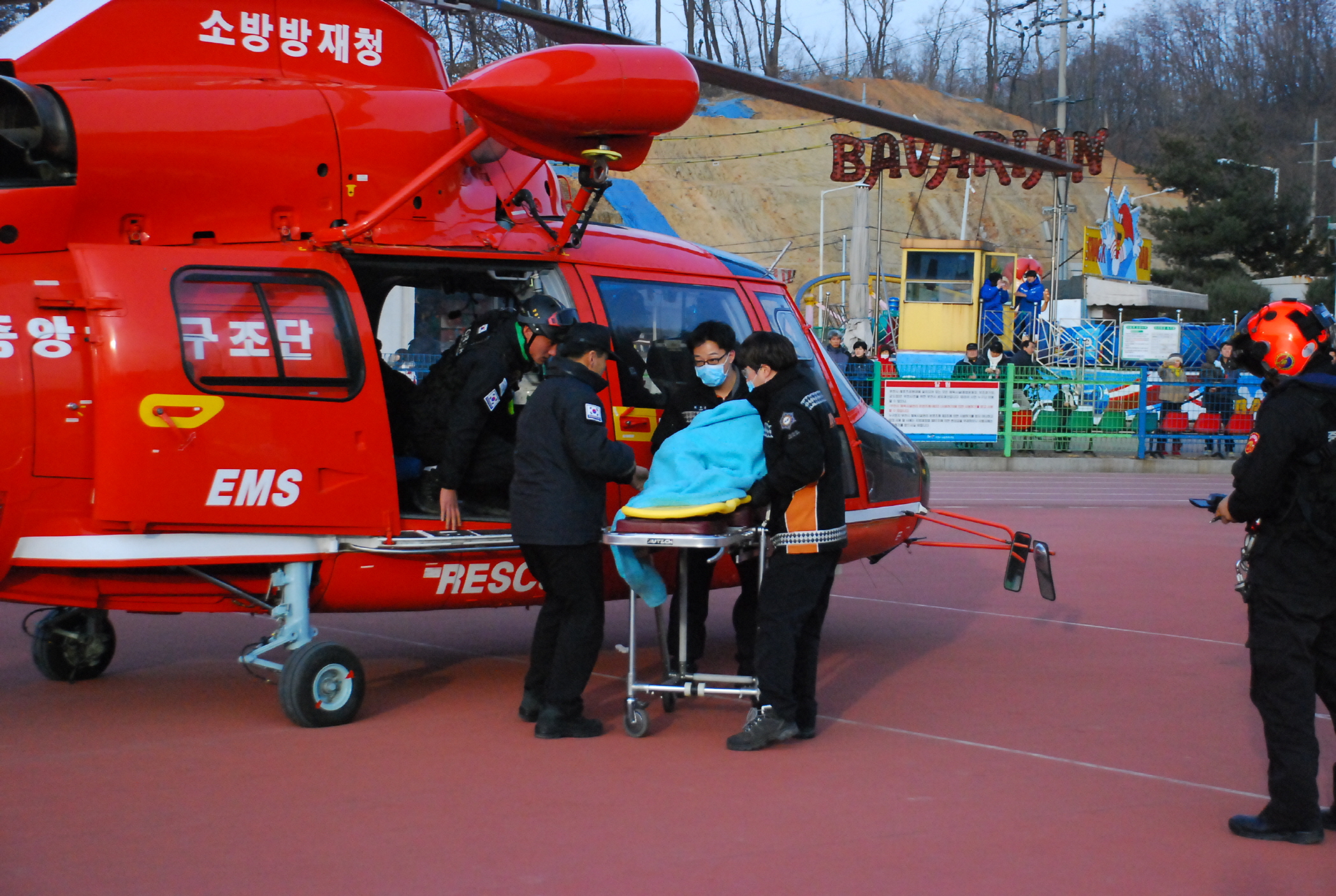 지난 15일 일요일 오후 4시경 부천종합운동장 보조구장에 소방방재청 중앙119구조단 소속 헬기 두 대가 착륙하였다. 이는 인천 연평도에 거주하는 한 노인의 심장질환에 따른 긴급 환자 수송에 따른 것으로 오후 3시경에 소방방재청에서 부천시시설관리공단 측에 긴급으로 보조구장 사용 협조요청을 하여 이루어지게 되었다. 긴급환자는 헬기에서 구급차로 옮겨져 즉시 세종병원으로 향했으며, 긴급환자의 원활한 수송과 시설 이용 시민들의 안전을 위해 헬기착륙 전 공단 소속 직원 5명이 직접 보조경기장 이용을 통제하였으며, 또한, 휴일을 맞이하여 주변 경인랜드 놀이시설과 눈썰매장을 방문한 많은 시민들의 질서유지와 안전을 위해 시설관리공단에서는 사전에 안내방송을 실시하여 별다른 특이사항 없이 소중한 환자의 생명을 구하기 위한 긴급 수송이 마무리 된 것으로 알려졌다. |