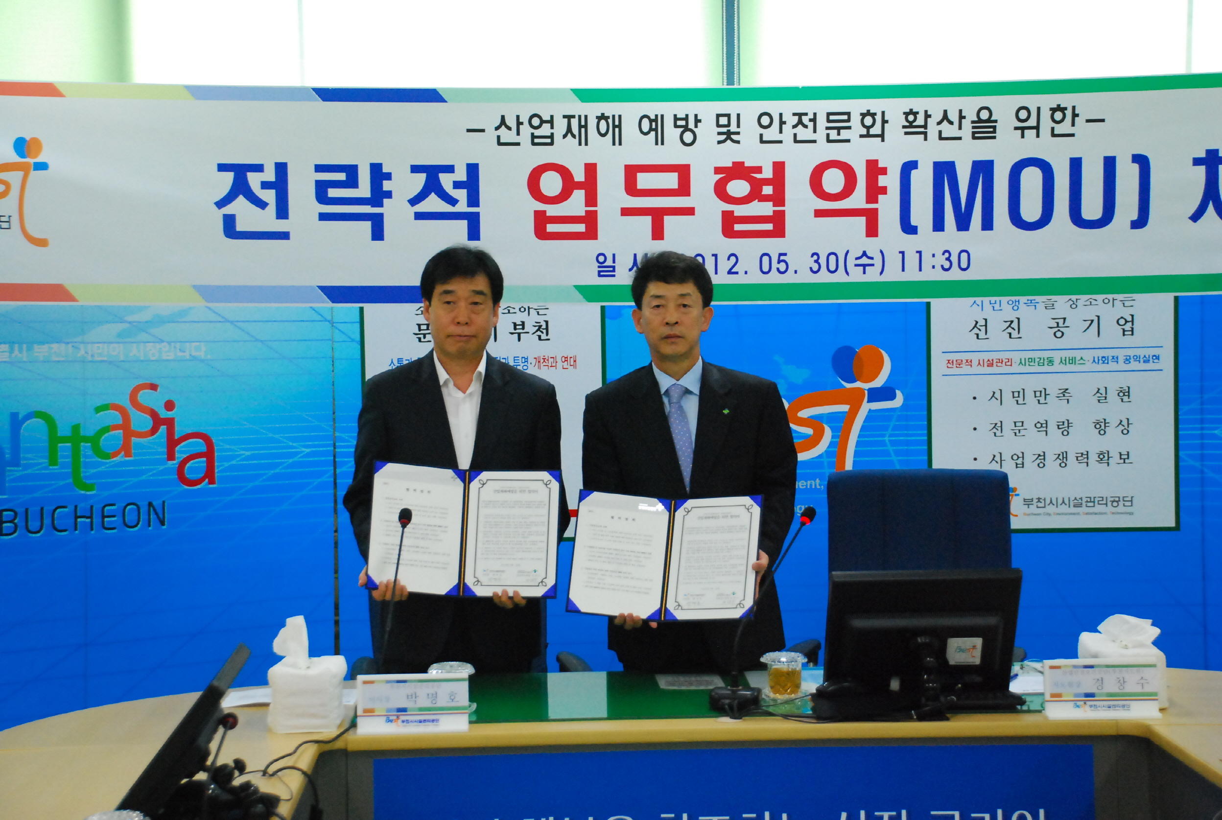 공단 상황실에서 열린 업무 협약식에는 공단 박명호 이사장, 경창수 산업안전보건공단 부천지도원장이 참석하였으며, 두 기관은 안전한 기업문화 확산을 위한 지식, 정보, 기술 등의 교류를 통해 상생하는 전략적 협력 관계를 지속시킬 것을 약속했다.