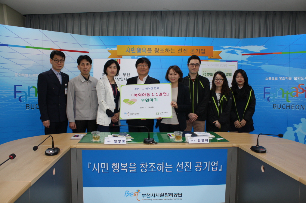 부천시시설관리공단(이사장 임명호)은 4월 28일(화) 국제구호개발 NGO단체인 굿네이버스 경기부천지부(지부장 김민애)와「해외 아동 1:1 결연」후원식을 진행하였다.