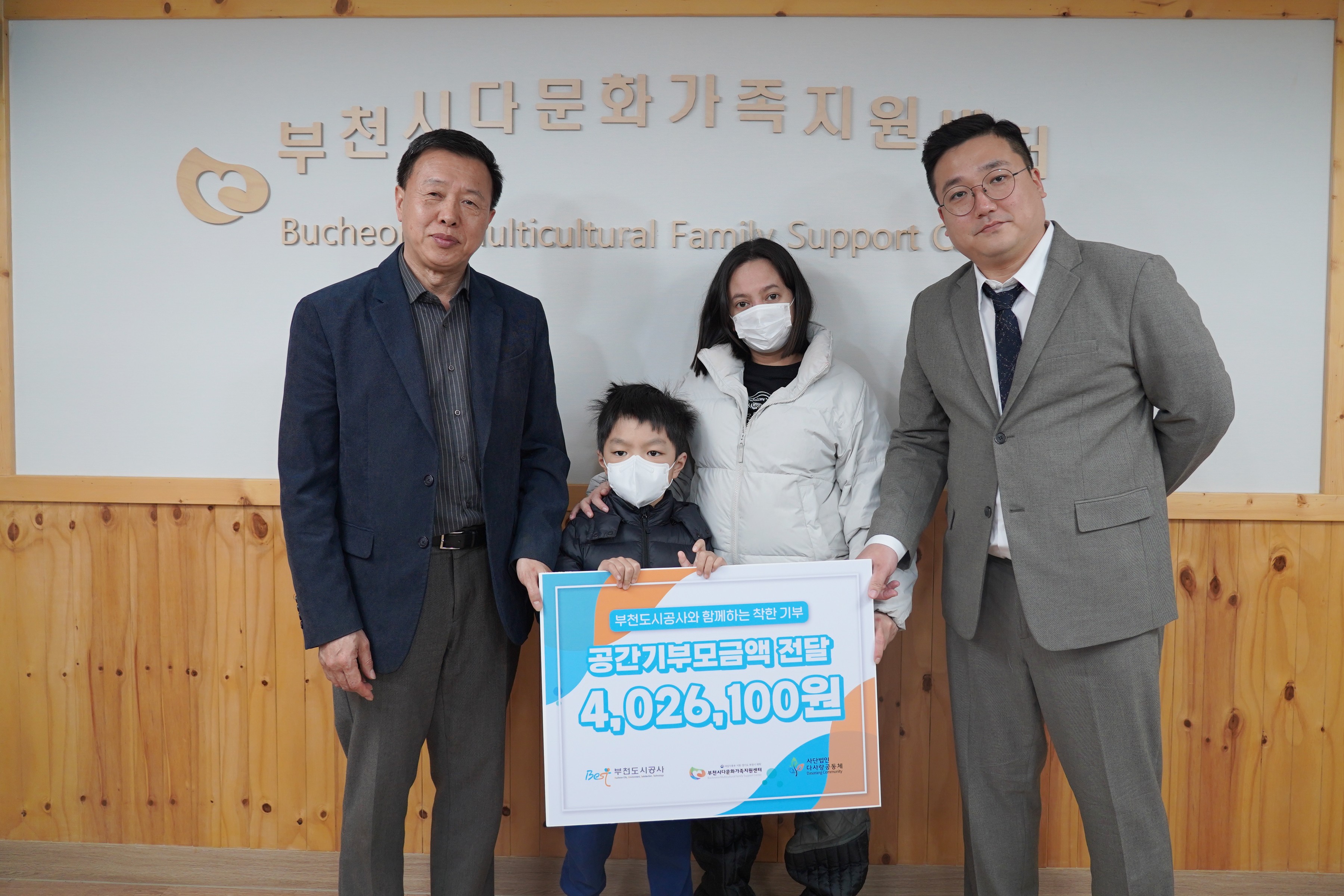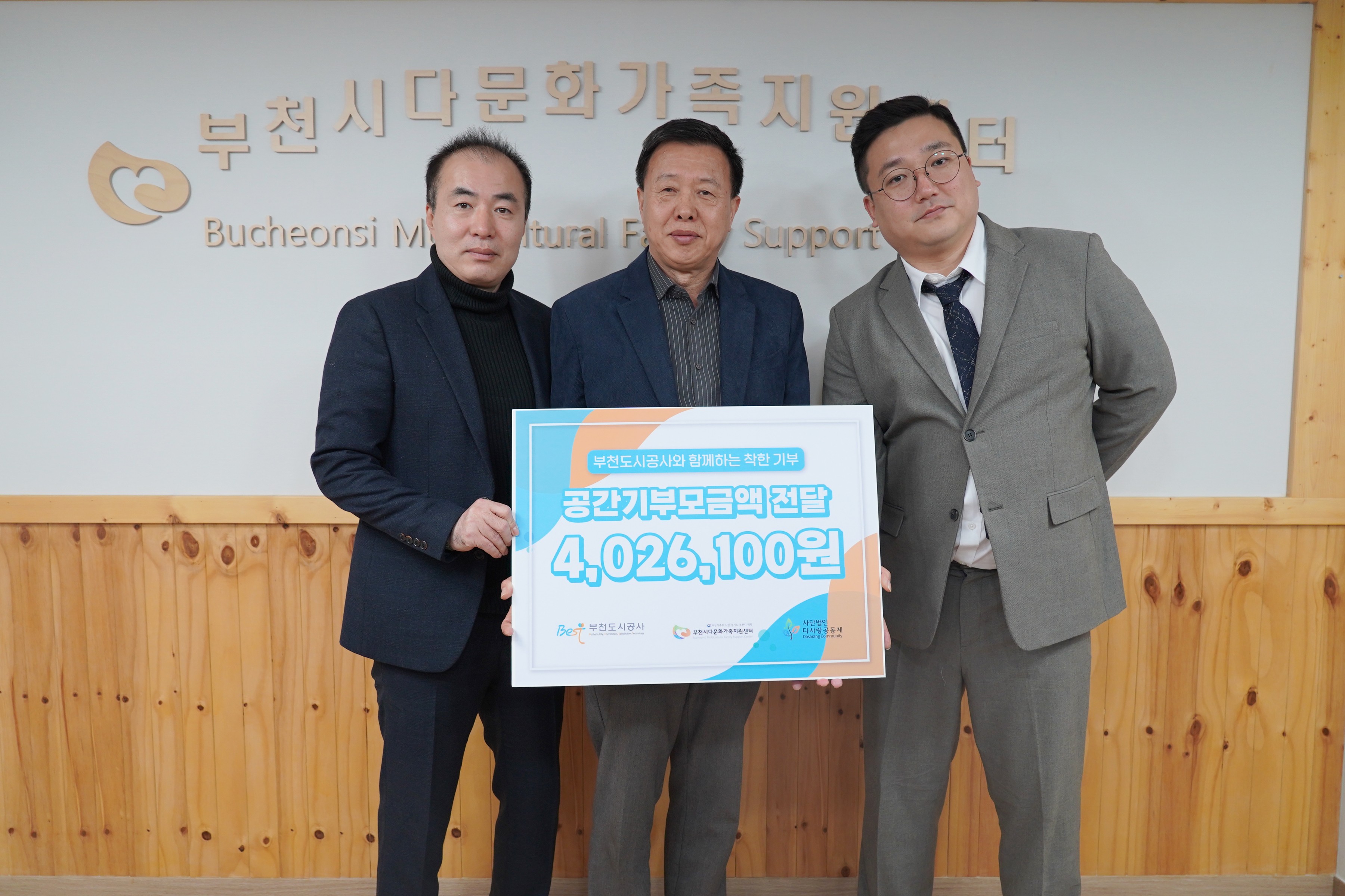 공간기부 모금액 전달식 작성자 최** 등록일자 2024년 2월 20일 13시 38분 57초 조회 387 240220 공간기부 전달식_2 다문화 공사 다사랑.JPG [ Size : 1.07MB , Down : 244 ] 미리보기 다운로드 240220 공간기부 전달식_3 공사 다사랑 지원가족.JPG [ Size : 1.25MB , Down : 232 ] 미리보기 다운로드 목록보기