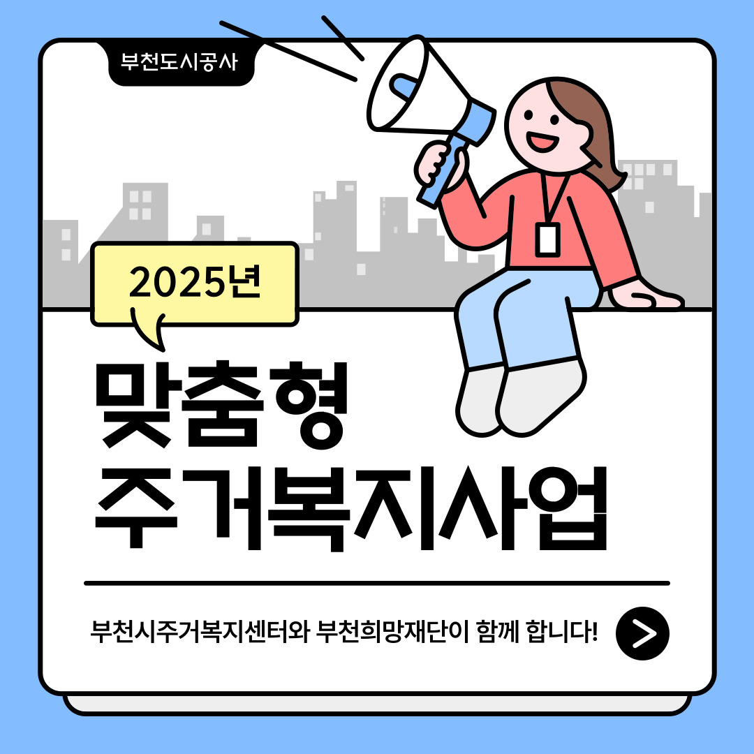 2025년 주거환경개선 프로젝트 "맞춤형 주거복지 사업" 안내 작성자 구** 등록일자 2025년 4월 17일 13시 14분 15초 조회 360 안녕하세요? 부천시주거복지센터입니다.많은 관심과 신청 부탁드립니다. 주거안심케어서비스(목록) < 주거환경 개선사업 < 사업소개 < 주거복지 : 부천도시공사 001.jpg [ Size : 157.87KB , Down : 151 ] 미리보기 다운로드 맞춤형 주거복지 사업 안내.pdf [ Size : 2.65MB , Down : 220 ] 미리보기 다운로드 목록보기