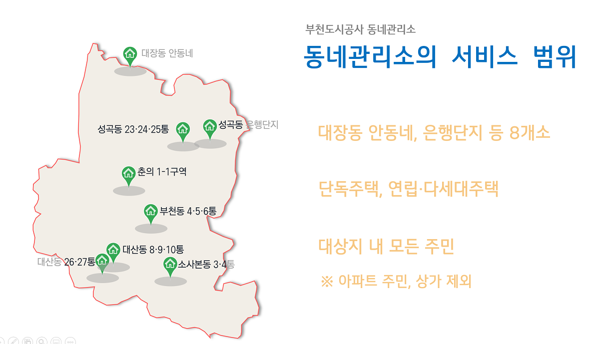 동네관리소 확대 운영 작성자 구** 등록일자 2021년 5월 13일 7시 15분 49초 조회 386 동네관리소 집수리 지원서비시가 대폭 확대됩니다. ○ 서비스 기존 지역 : 춘의1-1구역(부천동), 은행단지(성곡동)○ 서비스 추가 지역 : 소사본동 3~4통, 대산동 26~27통, 성곡동 23~25통, 부천동 4~6통, 대장동 안동네(오정동), 대산동 8~10통 동네관리소서비스확대.png [ Size : 140.13KB , Down : 245 ] 미리보기 다운로드 목록보기